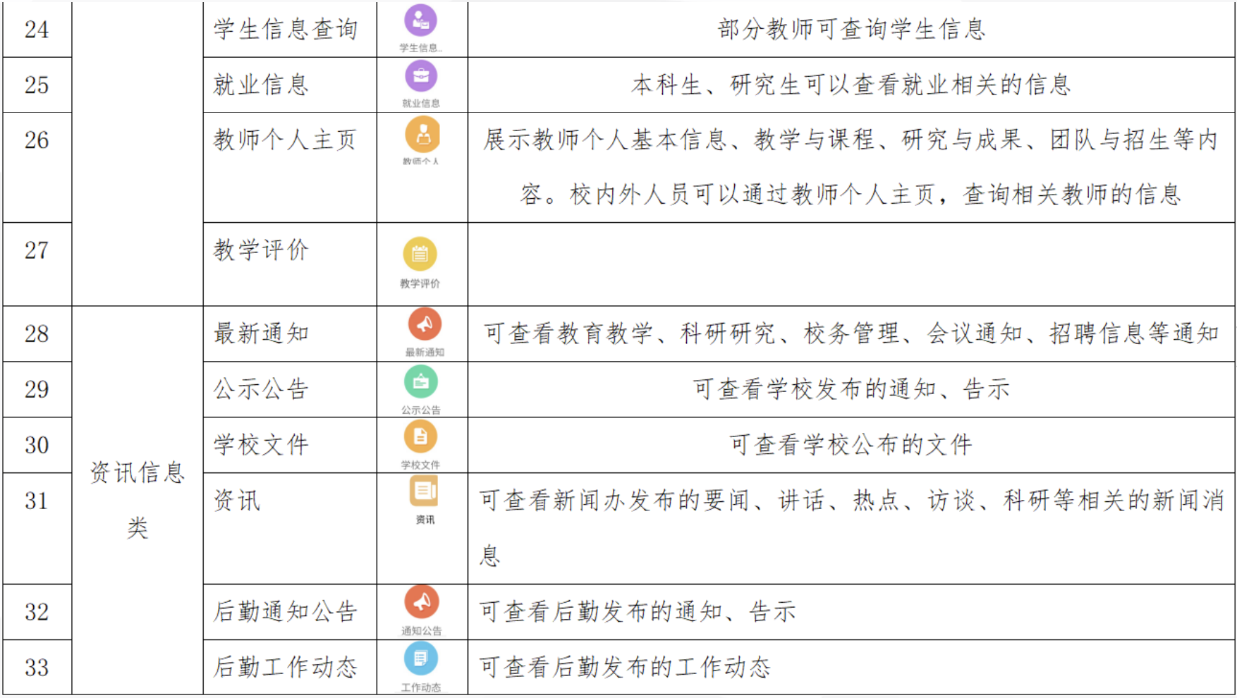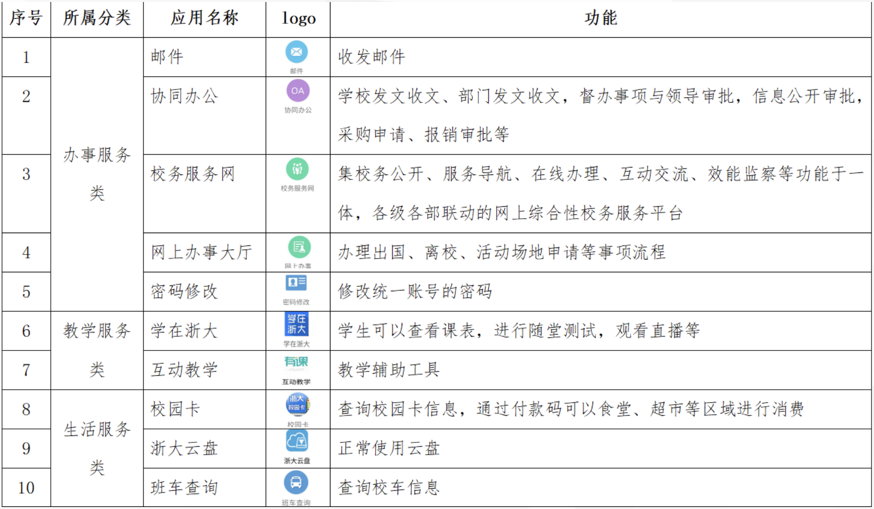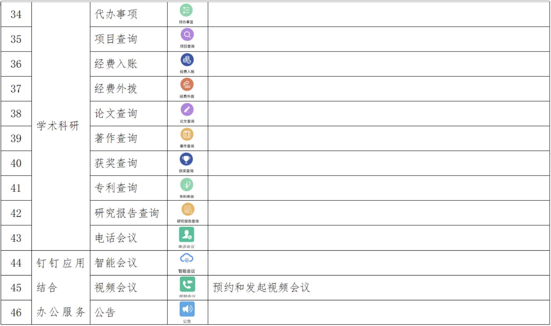 在我们的日常学习中,有很多校务相关的操作都是通过浙大钉里面的工作台来完成的,下表是对于浙大钉工作台各项功能的介绍: